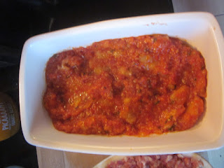 Orezul și ceapă tocată mărunt, se călesc în puțin ulei și apă, cca. 10 minute la foc mic, neacoperit. Carnea tocată sse amestecă cu baconul cubulețe și amestecul de orez călit cu ceapă. Se asezonează de sare și piper, după gust, atenție baconul s-ar putea deja să fie suficient de sărat.