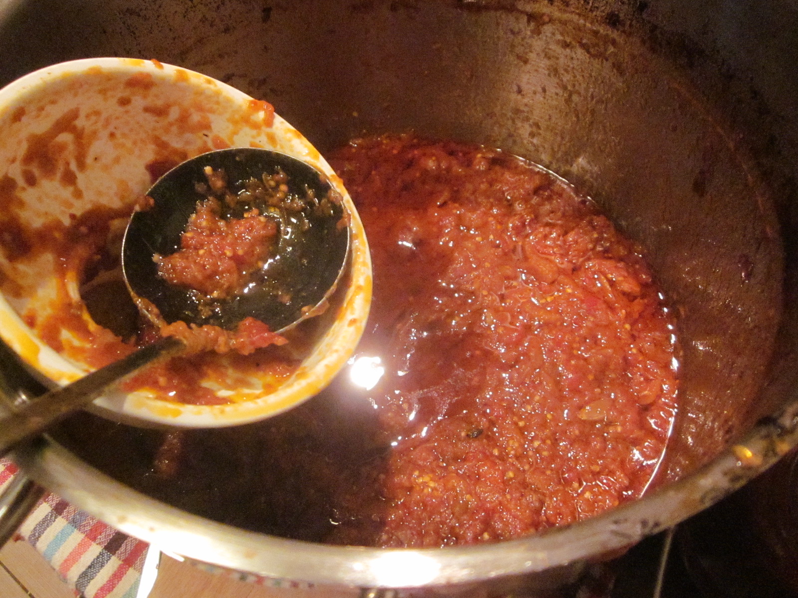 Apoi se adaugă ardeii  curăţaţi şi tocaţi mărunt. Se lasă se dea în clocot, apoi se adaugă vinetele scurse şi tocate. Se adaugă restul de ulei, bulionul de roşii, se asezonează de sare, se adaugă foile de dafin şi boabele de piper după gust.